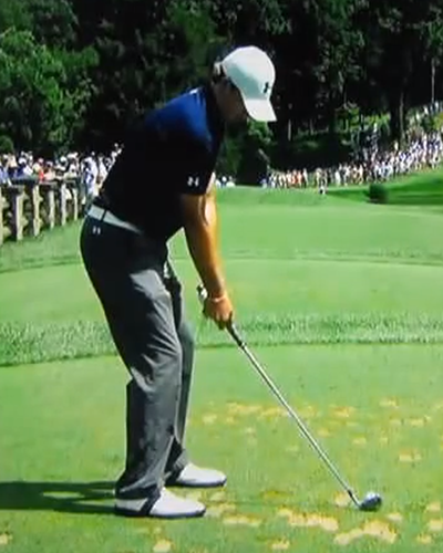 Jordan Spieth’s left arm is slightly flexed at impact. It is a common misunderstanding to think that the left arm has to be straight at impact. In fact, we see many great players with bent left arms at impact.